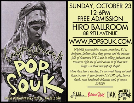 Nightlife personalities, artists, musicians, DJ’s, designers, fashion sluts, drag queens, and the creative folk of Downtown NYC are usually blessed — and cursed — with fabulously overflowing closets or studios filled of their own designs. For one day only both floors of the majestic Hiro Ballroom will make way for POP SOUK. More than just a marketplace, it’s an event where some of the most fabulous New Yorkers will be hanging out and selling their old and new treasures, in their own personal pop-up shops- including Amanda Lepore, Asher Levine, Chris Habana, Patricia Field, Oak, Patrick McDonald, Telfar, Scooter LaForge and many more!!! Listen to some of your favorite New York DJ’s spin, hang out on the top floor lounge watching the action of people shopping in the stalls below, saddle up to the bar for a drink, get your nails done, taste the delicacies you never knew these night creatures could make and, of course, shop!