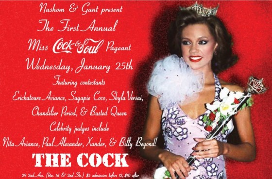 In an effort to continue to bring to you the most ridiculous and yet the finest entertainment in the entire WORLD, tonight’s installment of Cock & Soul will be The First Annual Miss Cock & Soul Pageant! Contestants will be competing for a $250 dollar prize and their own Cock & Soul solo showcase! Categories include Elegant Evening Gown, Lipsync Talent and Ridiculous Swimwear…and the bevvy of beauties looking to snatch the title…Erickatoure Aviance, Sugapie Coco, Skyla Versai, Chandilier Period, Busted Queen and more T.B.A.!!! Judges Nita Aviance, Paul Alexander, Xander and Billy Beyond.